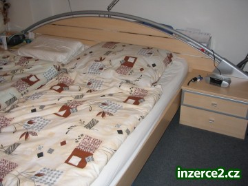 Manželská postel – 2 roky stará, výborný stav, 200x180 cm + noční stolky + polohovatelné rošty, barva buk (sestava Fabiola – SCONTO)