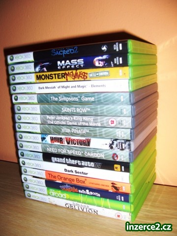 Prodám balík 16 her na X box 360 možno zaslat dobírkou poštovný (90 kc)-platí kupující hry prodam za 2600 kc při rychlem jednaní možno slevy. balík obsahuje tyto hry : GTA IV,Hour of Victory,Dark sector,NFS:Carbon,Monster madness,Banjo-Kazoie,Oblivion,The Simpsons game,MASS Effect,Viva pinata,King Kong,Dark Messiash,Sacred 2, Arcade games, Saint row, The orange box (Half Life2,Half life 2 episode two,Portal a Team Fortress 2.