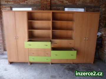 Prodám nábytkovou stěnu složenou ze 4 skříněk. Vyrobena z kvalitního lamina buk tl. 18 mm. Skřínky jsou ve smontovaném stavu. V. 1850, h. 520, š. 3200. Uprostřed je 7 prostorných šuplíků. Za dveřmi na každé straně po čtyřech policích.