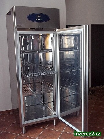 Vnitřek i venek z nerezu. Vnitřní ventilátor cirkulace mrazícího vzduchu. Koncový spínač na dveřích. Ochlazovací ventilátor kompresoru. Osvětlení. Hmotnost 240 kg. Kovové regály (hloubka 65 cm, šířka 53 cm). Na panelu teploměr. Dole 4 nerezové nožičky s možností regulace výšky (dají se odšroubovat).