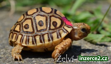 Nabízím krásně vybarvená mláďata suchozemských želv pardálích z mého chovu - nejedná se o import! Mohu zprostředkovat i prodej kompletně vybaveného terária, na míru pro želvy. Pardálky jsou NEZIMUJÍCÍ druh a NEREGISTRUJÍ SE - neplatí pro ně zákonná povinnost každý rok aktualizovat fotku v dokumentech a komunikovat s úřady. Želvičky jsou chovány v perfektních podmínkách – dobře „nastartované“ a rostoucí.