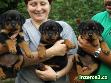 Štěňata rotvajlera s PP po špičkových vyrovnaných rodičích, opakované spojení, předpoklad pěkného exteriéru, povah i zdraví, poslední volná fenka - má tmavé oči a výrauné pálení. Celodenní péče. Mob.728529218.